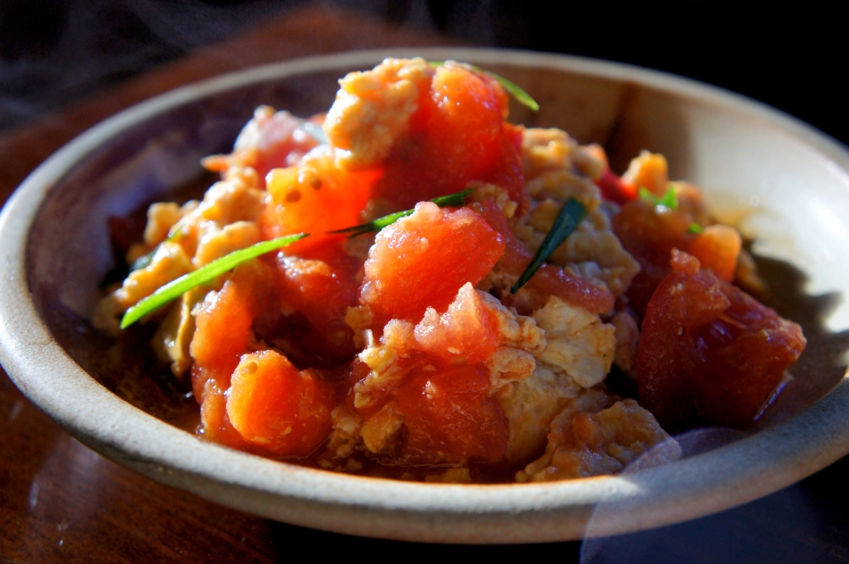 - Heat up a little cooking oil in the middle of the frying pan, add tomato pieces, sauté briefly, add sugar and oyster sauce, stir well
