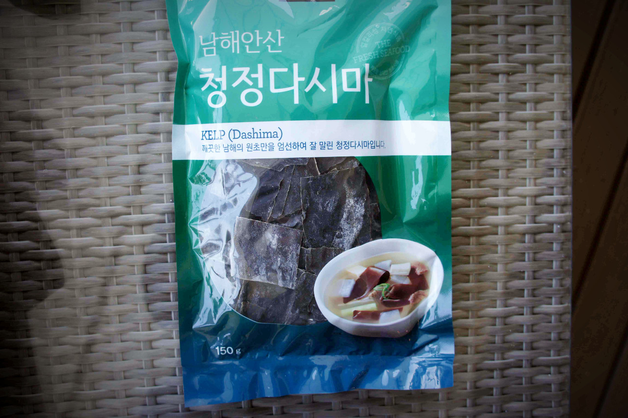 - Drain the soup from the solids, add soy sauce and sesame oil to the soup; reserve a few pieces of kelp to serve with the soup; slice the kelp into strips