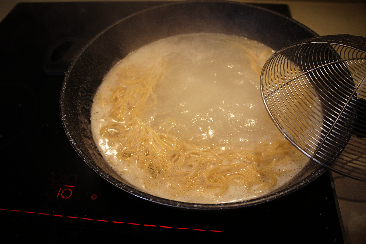 - Once the noodles are cooked, use a sieve to scoop them out and rinse them under cold water. Shake off any excess liquid.