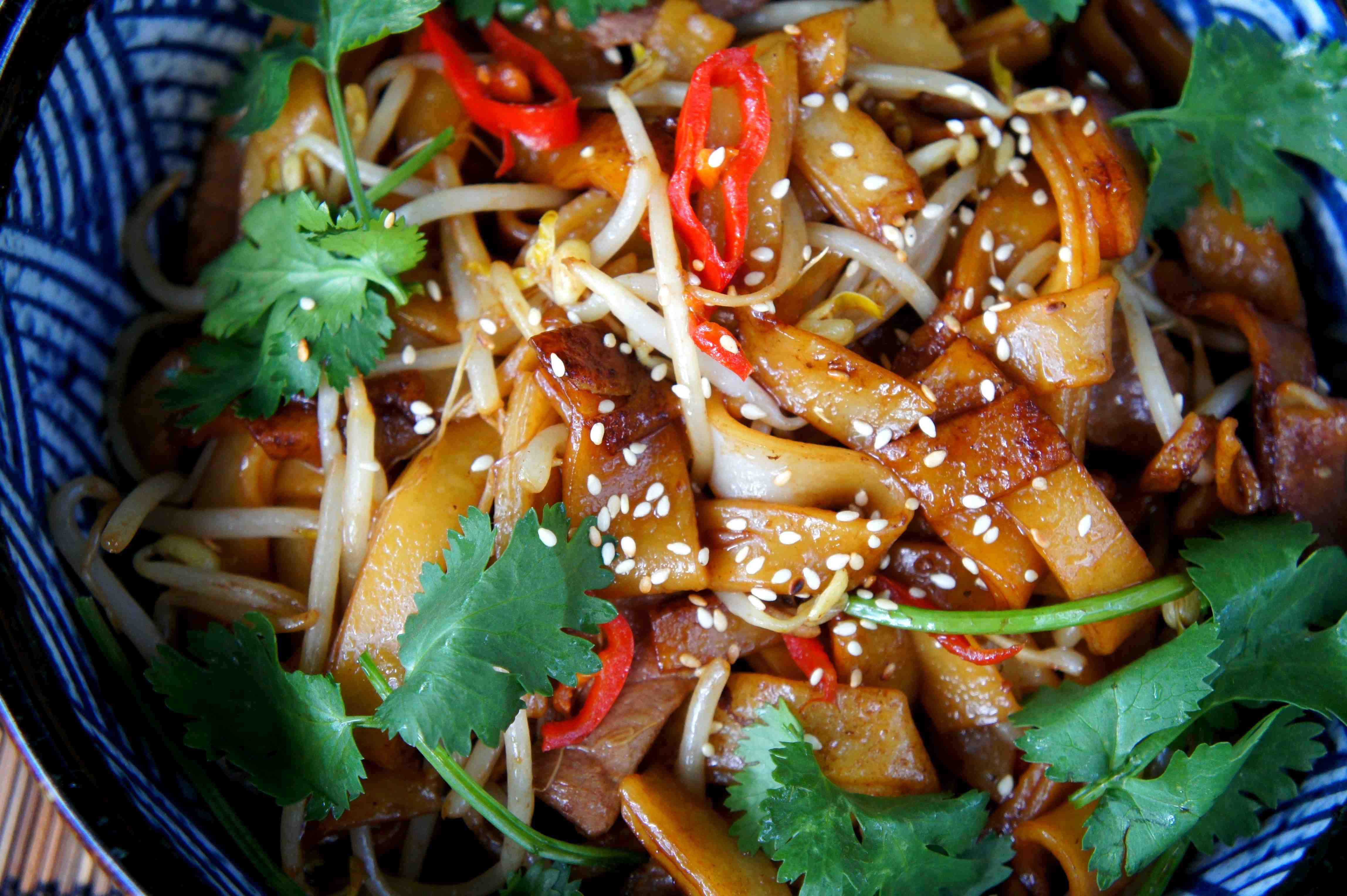 Wok fried ‘dry’ beef rice noodles (hor fun) with bean sprouts, 干炒牛河